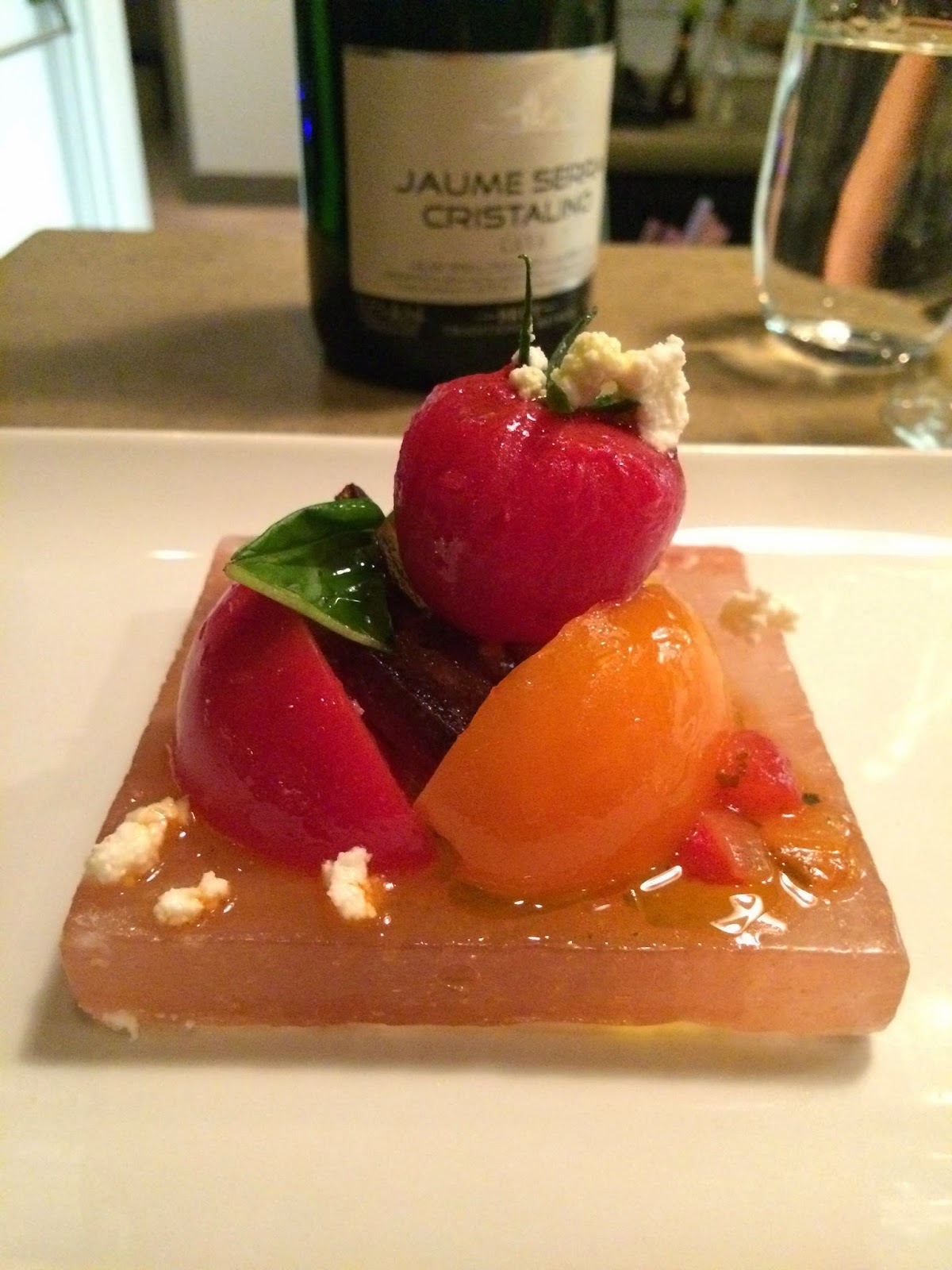 Zion & I then decided that spending our Friday night at RGE RD would be a great idea...& who am I kidding, you can't go wrong with RGE RD. We indulged (again) & ordered the RGE RD Trip, which is a chef's choice, six-course meal, with the beverage pairing...& I'm salivating just remembering our meal! My favourite was the first course, which was just so simple: fresh, ripe, sweet locally grown tomatoes, drizzled in basil oil, perched perfectly on a few flavourful & savoury croutons, topped with fresh basil & house-made ricotta...& all of that placed on a small salt block for personalizing the amount of salt per bite! It was served with one of the very few wines that both Zion & I enjoy with no complaints: Jaume Serra Cristalino. The following pictures really don't do it justice so if you haven't been, it is a must-eat-at type of restaurant in Edmonton! Have the exclamation marks convinced you yet?!